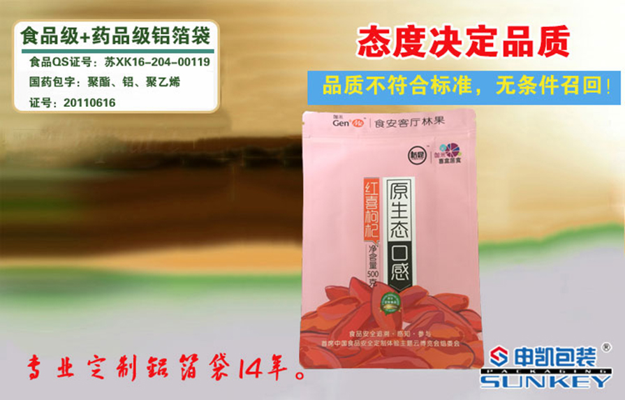 枸杞包裝鋁箔袋,拉鏈條自封,有易撕口,申凱包裝專業定制十四年,歡迎進行咨詢。